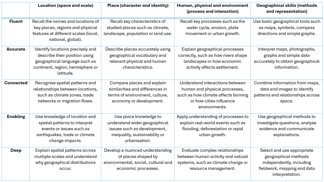 Across each of these domains, knowledge can appear in different ways. Pupils may demonstrate fluent knowledge, recalling key locations, processes or characteristics. They may show accurate knowledge, using precise geographical vocabulary or explaining processes correctly. Knowledge can also become connected, where pupils recognise patterns and relationships across space.